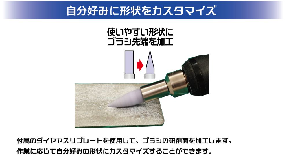 付属のダイヤモンドヤスリプレートを使用すれば、ブラシ先端の形状を用途に合わせて加工可能。形状を調整することで切削力を引き出し、さまざまな研磨シーンに対応します。