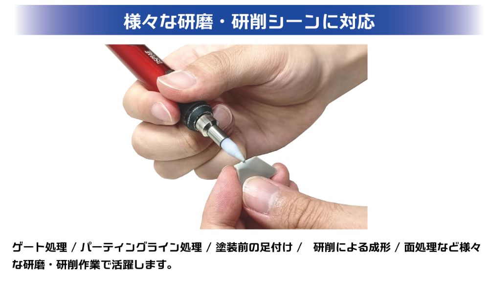 ゲート処理/パーティングライン処理/塗装前の足付け/ 研削による成形/面処理など様々な研磨・研削作業で活躍します。