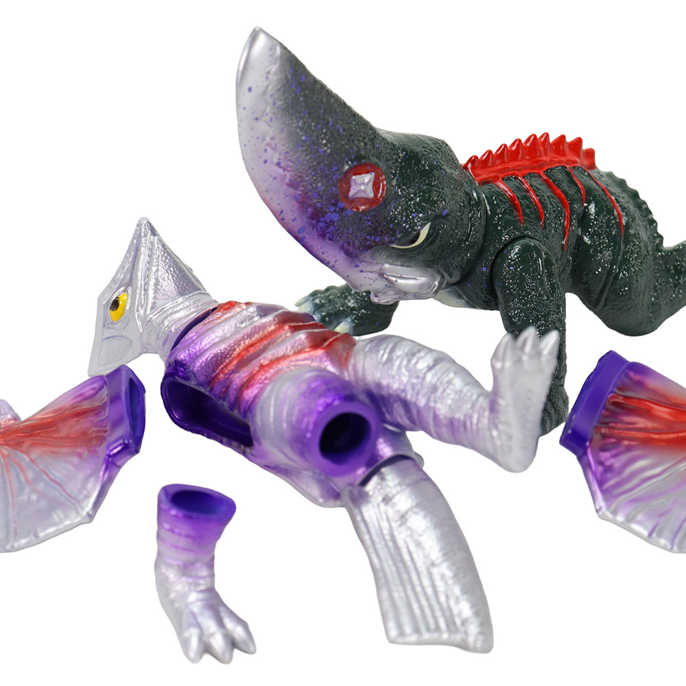 ギロンとの闘いで切断された部位を実際にソフビを切断することで劇中の状況を再現。