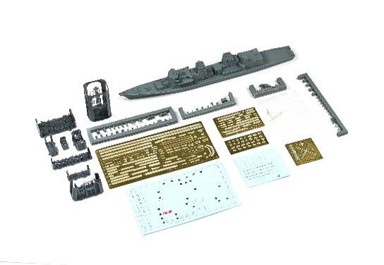 - キットはレジンパーツ、エッチングパーツ、金属パーツ、3Dプリンター製パーツの複合素材キットとなっています。従来のレジンパーツキットの印象を払拭する精度とディテールが盛り込まれたキットとなっていて1/350スケールと見紛うばかりです。