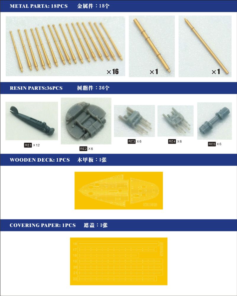 商品内容は木製甲板、エッチングパーツ、コンバージョンセットとなっています。コンバージョンセットはエッチングパーツ、金属パーツ、3Dプリンターパーツ、レジンパーツ、マスキング材などから構成されています(商品により構成パーツは異なります)。