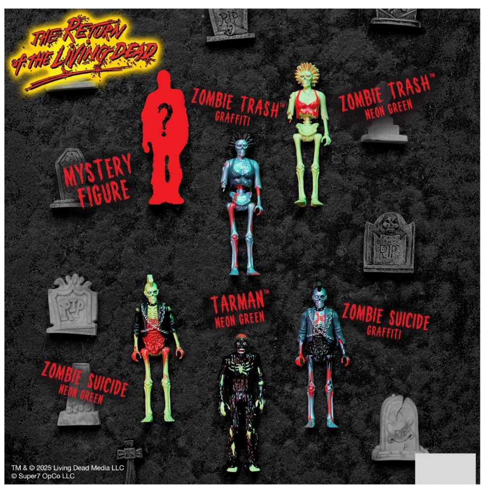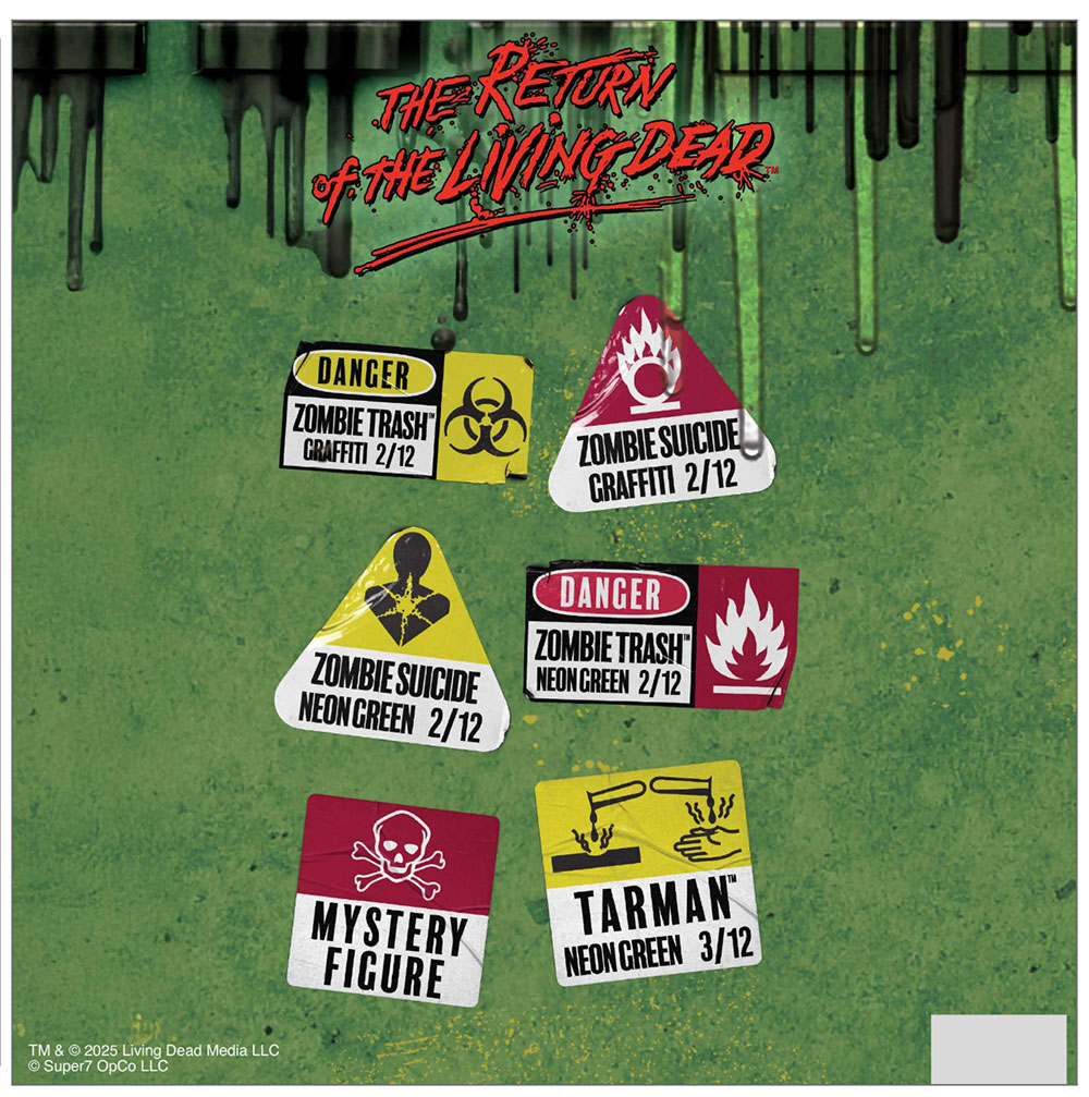 独特なノリが頭に残る1985年の傑作映画『バタリアン(RETURN OF THE LIVING DEAD)』。その貴重な立体物の一つとなったスーパー7のリアクションフィギュア。そんなリアクションフィギュアたちがトレーディングフィギュアとなって登場!"あの"ドラム缶をイメージしたトレーディングフィギュアのパッケージはもちろん、それを抱えるようなデザインとなったタールマンのディスプレイボックスデザインもたまりません。ラインナップはタールマン(ネオングリーン)、ゾンビトラッシュ(ネオングリーン)、ゾンビトラッシュ(グラフィティ)、ゾンビスーサイド(ネオングリーン)、ゾンビスーサイド(グラフィティ)、ミステリーフィギュアの全6種!