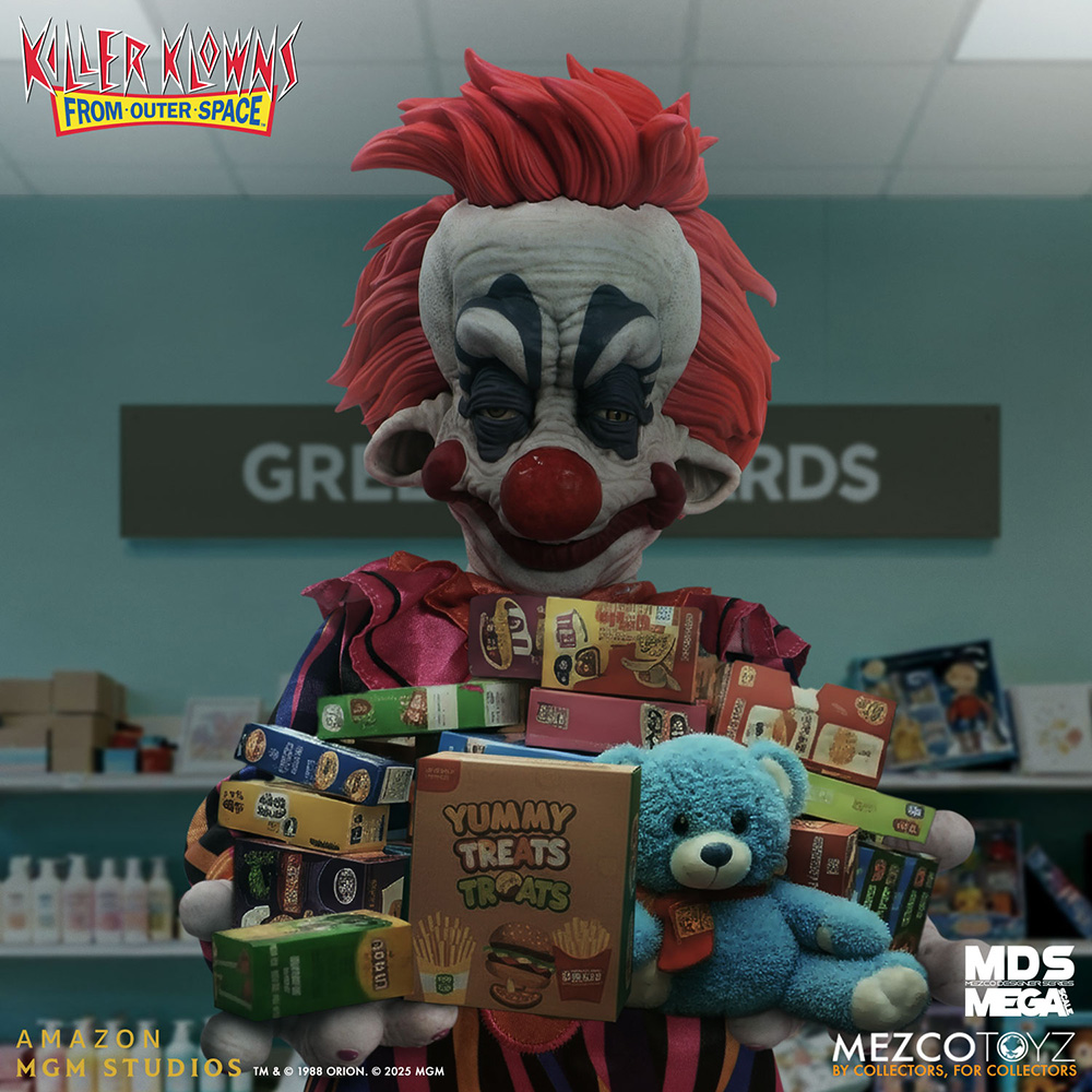 簡単なアクションポーズが可能な2~3頭身ボディ、顔はなかなかの「リアル」テイスト。そのオリジナルなデフォルメで人気、メズコのMDSメガスケール。2024年にはゲームにもなった、カルトな人気を誇る1987年の映画作品『キラークラウン』に登場する、サーカステント風宇宙船で地球侵略にやってきたクラウン風宇宙人の1体であるルディが、シリーズにラインナップ。印象的なド派手な衣装はもちろん、喉の奥から響くような笑い声やクラクション、ラバーチキンの鳴き声やカートゥーンアニメの様なハンマーがヒットした音など遊び心あるサウンドが収録されたギミックも搭載しています!