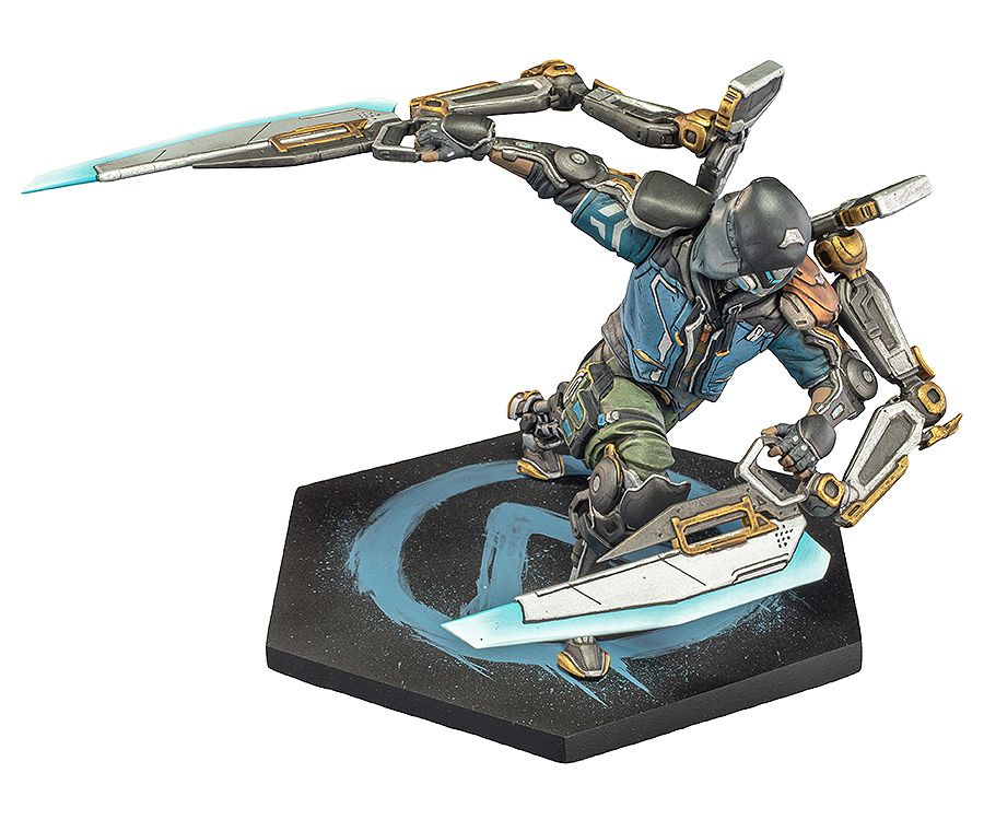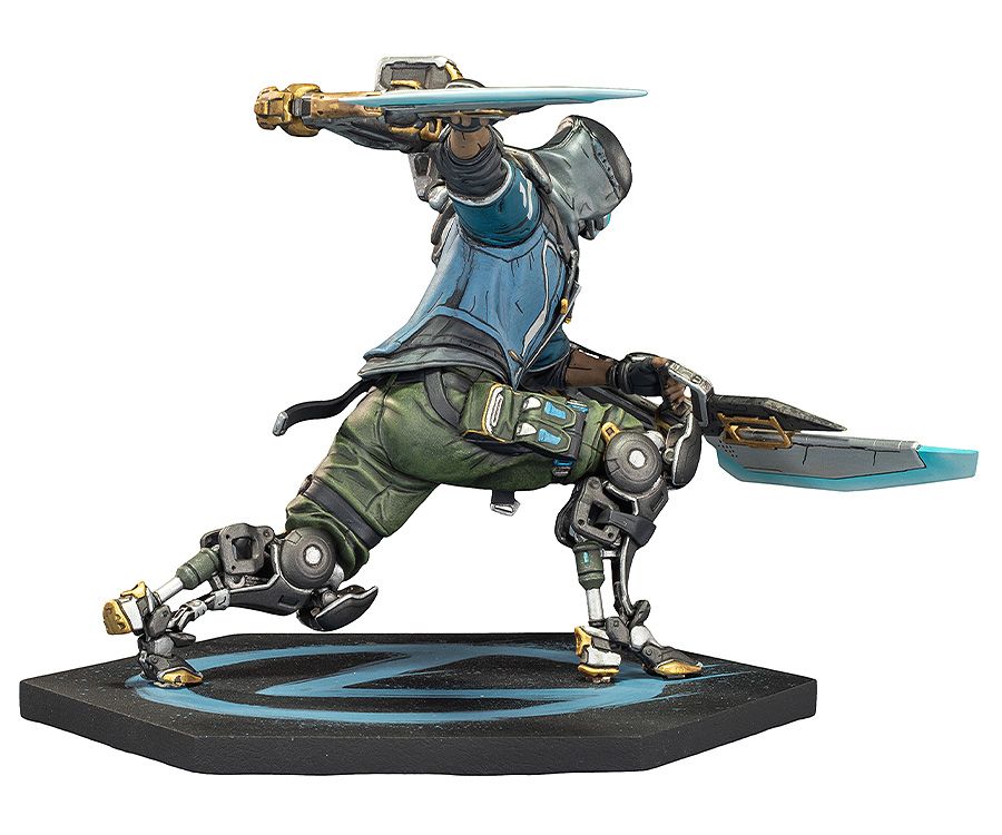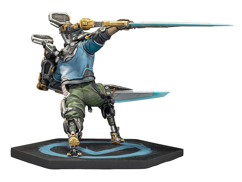 この超精巧なフィギュアは、エクソ兵士ラファがアークナイフを構え、周囲の敵に強烈な近接攻撃を仕掛ける瞬間を再現。高さ約16cm、幅約24cmの六角形ベースには、青いグラフィティ風のヴォルトシンボルが描かれている。