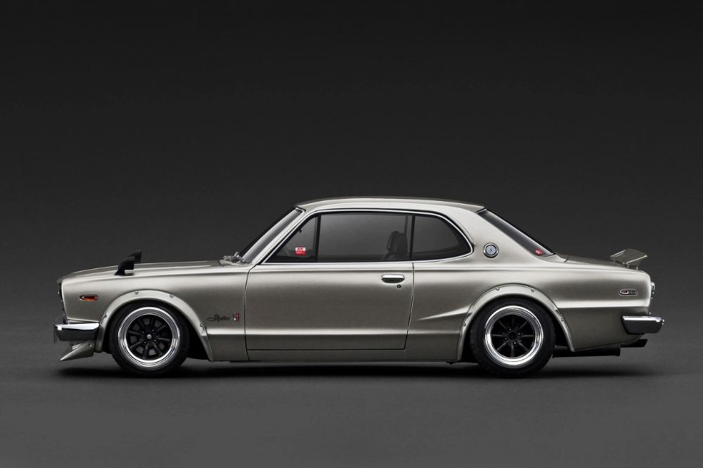 「ハコスカ 2ドア 2000 GT-R (KPGC10) 」を1/18スケールレジンモデルで再現。ボディカラー:濃いシルバー。RSワタナベ エイトスポーク15インチホイール(ポリッシュ&ガンメタリック)にローダウン仕様。フロントリップスポイラー、リヤスポイラー、前後オーバーフェンダー(ボディ同色)、デュアルマフラー、純正シート、純正ステアリングを装着。テールランプ右下に「PRINCE」、ウィンドウ部に「OK」「有鉛」シールを再現。
