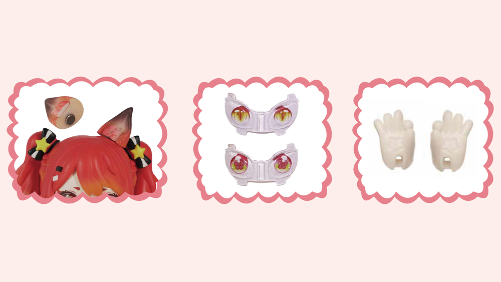 付属の耳はマグネットで脱着ができ、指先のポーズが違う手パーツも付いておりますので、様々なディスプレイを楽しむことができます。