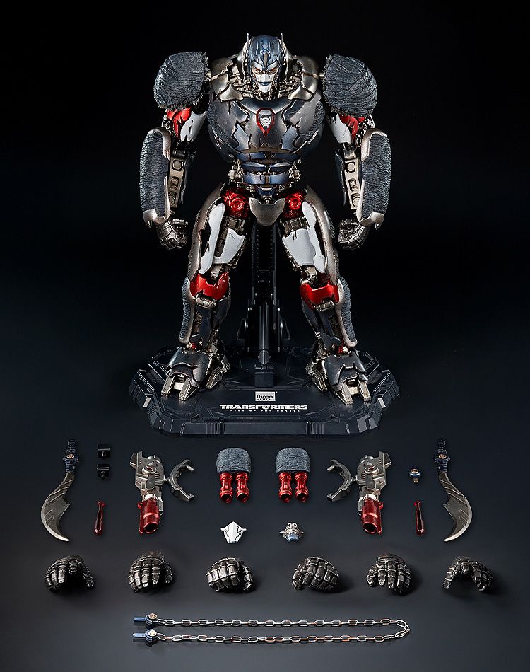 「DLX オプティマスプライマル(ビーストウォーズユニバースエディション)」はダイキャスト製金属を用いたフレームにより、全身の可動ポイントはシリーズ最多の約74ヶ所を実現。胴体、腕、そして脚にあるアクチュエーターシリンダーは実際に可動します。ウェザリング表現を含む精密な塗装が施されています。肩アーマーの特徴的な毛皮は軟質PVCで再現。頭部のマスクパーツは交換式のものが全3種類付属します(口が閉じたバトルマスク、口が開いたバトルマスク、バトルマスク無しの顔)。目にはLED発光機能を搭載。武器として、特徴的なサイバーブレードが2本付属。サイバーブレードはコネクターを介して1本に合体できる他、付属の金属チェーンを介しての接続も可能。交換式の手首パーツが全4対とDLXアクションスタンドが1個付属し、劇中の様々なシーンが再現できます。