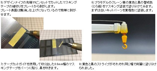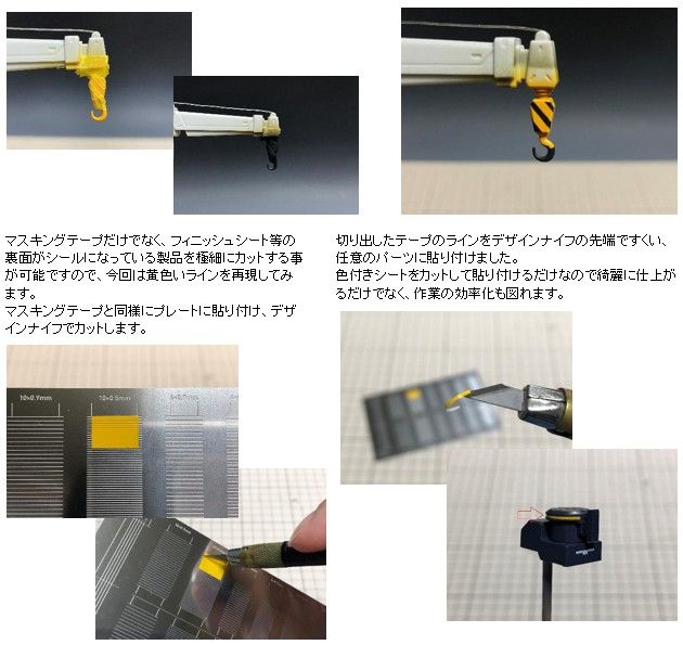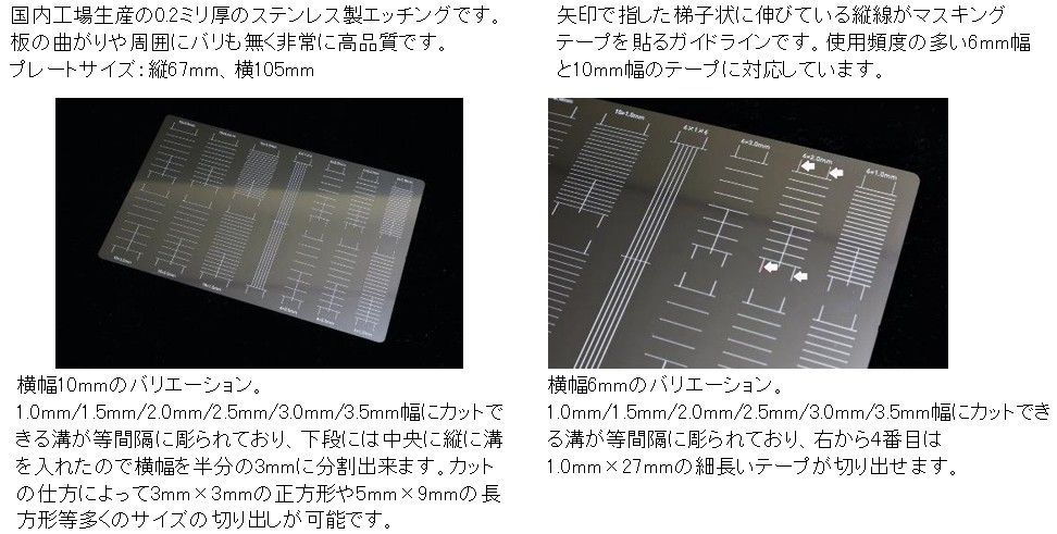 本商品はマスキングテープやマスキングシート、フィニッシュシート等を0.1mm間隔で極細幅ラインを大量に作成することができる、エッチング製のカッティングテンプレートガイドです。0.2mm厚のステンレス板に横幅6mmと10mmのスタンダードサイズのマスキングテープを、それぞれ1.0mm/1.5mm/2.0mm/2.5mm/3.0mm/3.5mm(テープカットガイド 01)、0.3mm/0.4mm/0.5mm/0.6mm/0.7mm/0.8mm/0.9mm/1.0mm/1.2mm(テープカットガイド 02)にカットできる溝が等間隔に彫られており、ガイドラインに合わせてマスキングテープを貼り付け、0.1mmの溝に沿ってデザインナイフなどでカットするだけで、手作業では難しい極細幅のテープが簡単に作成出来ます。またベースプレート型なので抜型と異なり、カットラインが歪む心配もありません。カット後はデザインナイフの先端やピンセット等で綺麗にはがして、塗り分けをしたいパーツに貼り塗装作業に入ります。