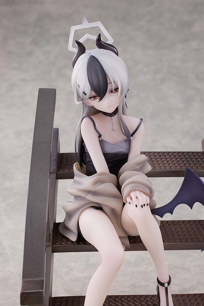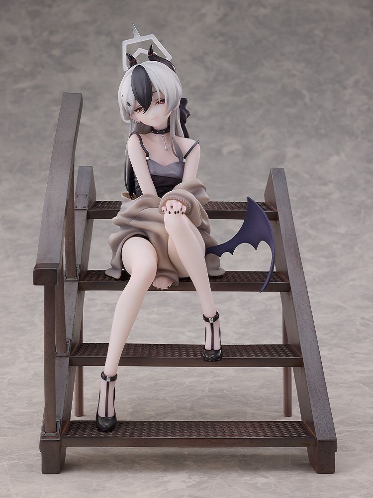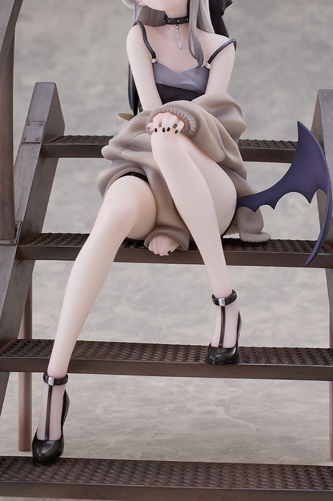 階段に腰を掛け、膝に手を添えたリラックスしたポーズ。脱ぎかけのカーディガンが柔らかく広がり、特徴的な片側の翼には淡い紫色の彩色が施されています。細めに開いた瞳でこちらを見つめる表情は、まるで猫のように気まぐれで、どこか甘えるような雰囲気も。