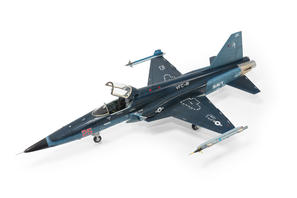 第4世代機相当のアドバーサリー機として、グラスコックピットへの改修や射出座席の換装が行われた最新仕様のF-5が登場します。Mk.16射出座席などコックピットの改修部分を新規金型で再現。また、ACMI(空戦機動計測)ポッドや、AIM-9Mミサイル/CATM-9M訓練ミサイルといった現代のアドバーサリー機に必須の機材が付属しています。マーキングはアメリカ海軍仮想敵部隊である第111混成戦闘飛行隊機2種が付属します。