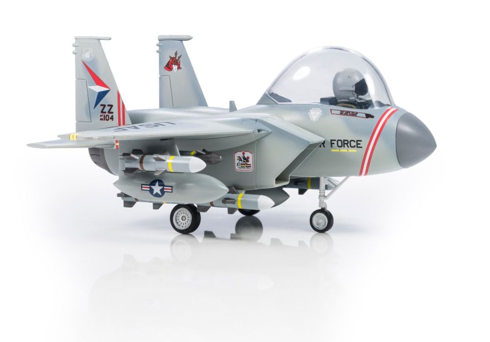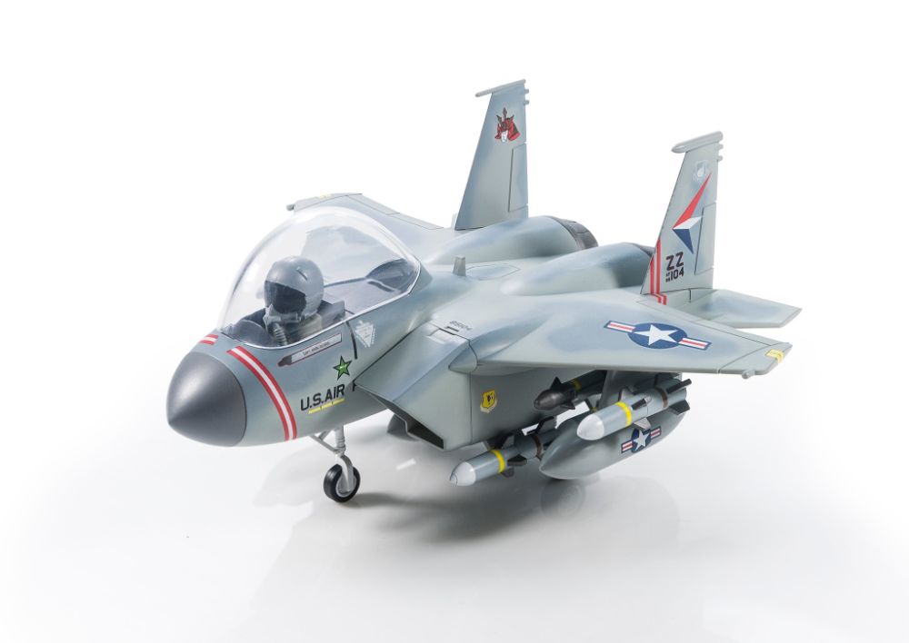 増槽はもちろん、全9種の武装が付属し、デフォルメされながらもパワフルなF-15のフォルムを存分に楽しむことができます。パイロットフィギュアのヘルメットはJHMCSと、HGU-55Pのいずれかを選択可能。飛行状態と着陸状態どちらかで組み立てることができます。アメリカ空軍大67戦闘機中隊所属機と、イスラエル空軍第133飛行隊所属機のデカールが付属します。