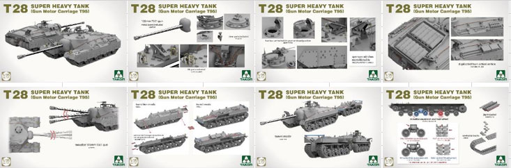 T28 重戦車(T95 戦車駆逐車)は第二次世界大戦中にアメリカで設計された旋回砲塔を持たない試作重戦車です。1943年に開発が決定され1944年にT28の呼称が与えられた本車は、ヨーロッパに構築された要塞線に配備されているドイツ軍の重/駆逐戦車群を撃破できる火力を備えていました。旋回式砲塔を装備せず密閉式の固定戦闘室を設けたT28は、1945年にT95戦車駆逐車へ改称されました。製造された2両のT28(T95)は1947年までアバディーン性能試験場およびフォート・ノックスで審査を受けました。本車の最大の特徴と言える、90t近い戦闘重量を支えるため接地圧の低減を図った内/外側の複列式の走行装置と履帯は、外側の走行装置をサイドスカートごと着脱し、鉄道輸送時や舗装路を走行する際は外側の走行装置を取り外して走行することが可能でした。また取り外した左右の外側走行装置は、サイドスカートが内側に来るように組み合わせて車体後方に牽引するよう設計されていました。アメリカ陸軍で唯一の突撃砲タイプの戦闘車両であるT28は、大戦の終結と本車の機動性の低さや超重量による運用上の制約、また1944年より開発が開始されたT29 重戦車の審査が優先された事により、1947年10月に開発計画は中止されました。試作された2両の内の1両は、フォート・ノックスのパットン戦車博物館に展示されています。