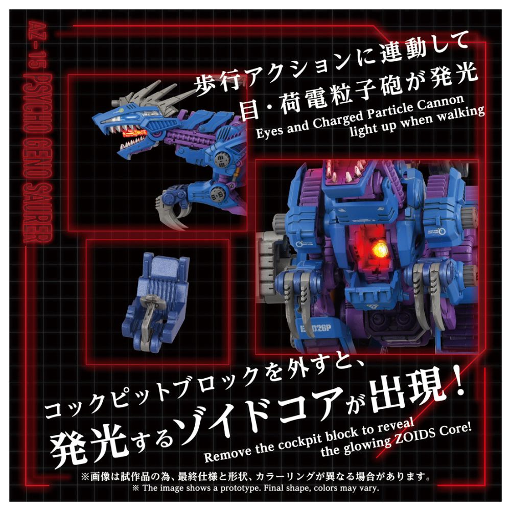 1/72スケールの組立キット。電動ユニットによりスイッチを入れることで恐竜らしい迫力のある歩行が可能。アニメ劇中で特徴的だった荷電粒子砲発射形態への変形を手動にて再現。目や荷電粒子砲、ゾイドコアがLEDで点灯。コックピットに搭乗可能な、1/72スケールのアニメキャラクターであるリーゼとオリジナル一般兵士のフィギュアと、オーガノイドのスペキュラーが付属(フィギュアは全て未塗装)。頭部、背部、脚部の武装を新規造形で再現。