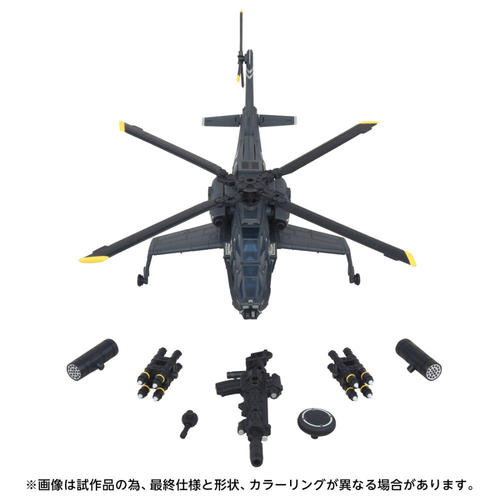 - ブラックアウト本体(1), テールローター(1), アサルトライフル(1), マシンガン(1), ミサイル(2), ロケット(2), 火器管制レーダー(1), フォルダ(1), ドキュメント(ストーリーシート)(1), ブループリント(スペックシート)(1), ステッカー(1), 取扱説明書(1)