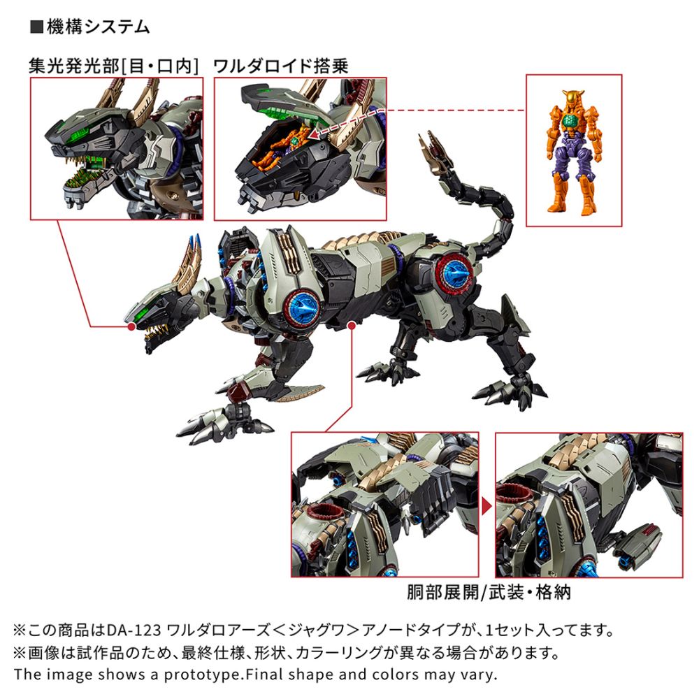 ワルダロアーズ <ジャグワ>は従来のワルダーメカ同様に変幻自在な形態変化機能も備えており、疾走や跳躍に適した4足歩行形態、接近格闘に適した2足歩行形態、機体を2機に分離した多重攻撃形態 等の状況に応じた単体可変は勿論、エヴォライズ等の他機体との強化結合合体能力も備えている。中でも機動巨兵ワルダレギン<ガイスト>(別売)との融合形態は、これまでの結合合体とは次元の異なる桁外れの攻撃戦闘力を持つ超絶強化形態である。