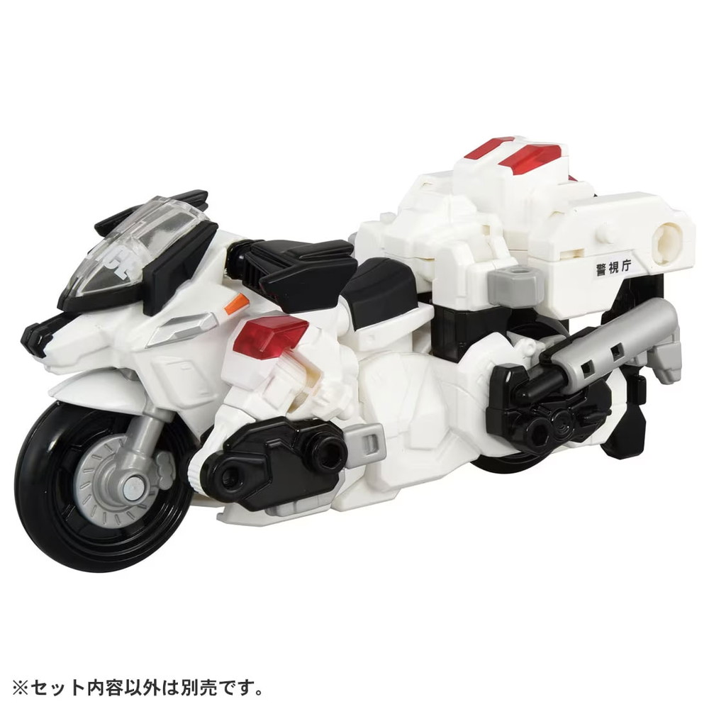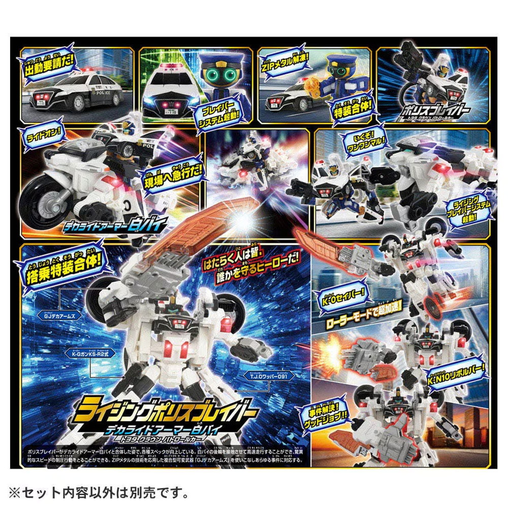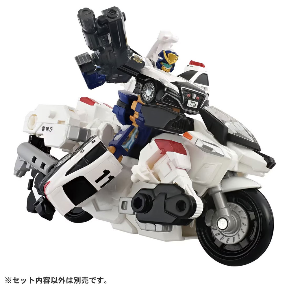 - アーマービークル(トヨタ クラウン パトロールカー)上半身パーツ(1)、アーマービークル(トヨタ クラウン パトロールカー)下半身パーツ(右)(1)、アーマービークル(トヨタ クラウン パトロールカー)下半身パーツ(左)(1)、警察ジョブロイド(1)、手錠型武器(1)、銃型武器(1)、デカライドアーマー白バイ 前輪パーツ(右)(1)、デカライドアーマー白バイ 前輪パーツ(左)(1)、デカライドアーマー白バイ 上半身パーツ(右)(1)、デカライドアーマー白バイ 上半身パーツ(左)(1)、デカライドアーマー白バイ 脚パーツ(右)(1)、デカライドアーマー白バイ 脚パーツ(左)(1)、デカライドアーマー白バイ 胴体(1)、デカライドアーマー白バイ 武器(1)、デカライドアーマー白バイ バイザー(1)、デカライドアーマー白バイ ハンドル(右)(1)、デカライドアーマー白バイ ハンドル(左)(1)、シール(1)、取扱説明書(1)