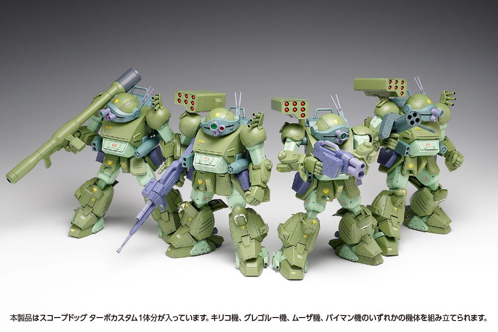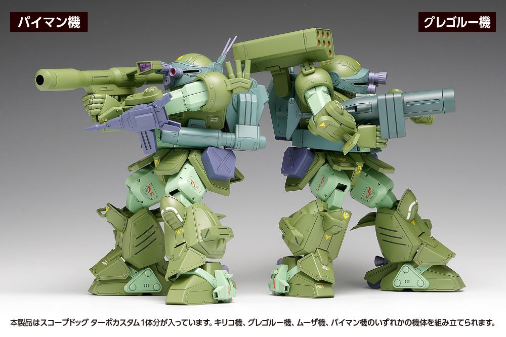 大好評いただきました1/24シリーズの第3弾「スコープドッグ ターボカスタム[キリコ機]」。続く第4弾は、OVA「ザ・ラストレッドショルダー」のメインキャラクター4人の機体どれもが再現できる「スコープドッグ ターボカスタム[DX]」がラインナップに加わります。武装は、7連ミサイルポッド、2連ロケットランチャー、ガトリングガンの固定装備に加え、ヘビィマシンガン(ショートバレルにも組み立てられます)、「ハンディロケットランチャー」、「ハンディソリッドシューター」、「ソリッドシューター」が付属しますので、「キリコ機」、「ムーザ機」、「グレゴルー機」、「バイマン機」、いずれの機体も再現することができます。「キリコ機」よりも武器が増え、ボリュームアップした内容ながら価格は据え置き。初回限定価格となっておりますのでこの機会にぜひ!