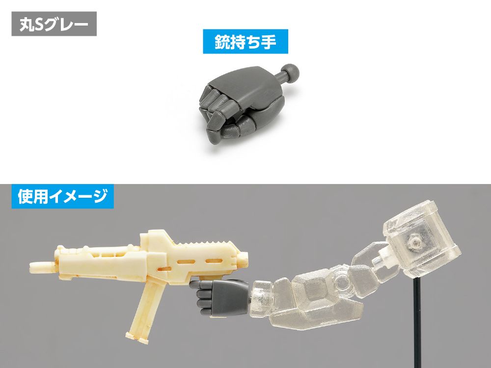 【ご注意】本製品は、接着・加工作業をともなう【上級者向け】モデルです。組立には市販の[プラスチックモデル用接着剤]、または、[瞬間接着剤]をご使用ください。各手首の根元は、使用するキットにあわせて、加工・調整してください。[武器持ち手]・[銃持ち手]は、使用するパーツやグリップにあわせて加工・調整してください。