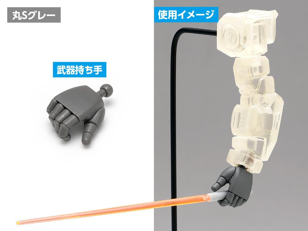 【ご注意】本製品は、接着・加工作業をともなう【上級者向け】モデルです。組立には市販の[プラスチックモデル用接着剤]、または、[瞬間接着剤]をご使用ください。各手首の根元は、使用するキットにあわせて、加工・調整してください。[武器持ち手]・[銃持ち手]は、使用するパーツやグリップにあわせて加工・調整してください。