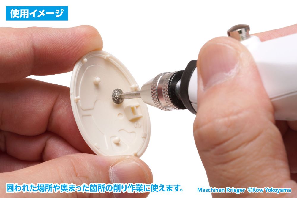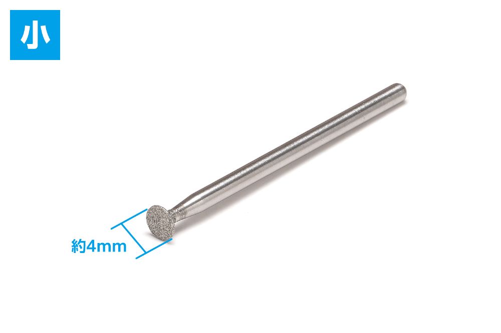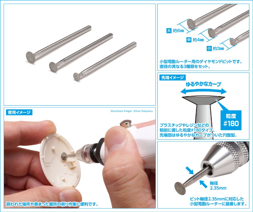 模型用の小型電動ルーターに装着して使用するダイヤモンドビット。先端部はゆるやかなカーブがついた円盤型。囲われた場所や奥まった箇所の作業に便利です。プラスチックやレジンなどの粗削りに適した粒度#180タイプ。直径の異なる3種類(大・中・小)をセット。※説明内の各サイズは参考値です。