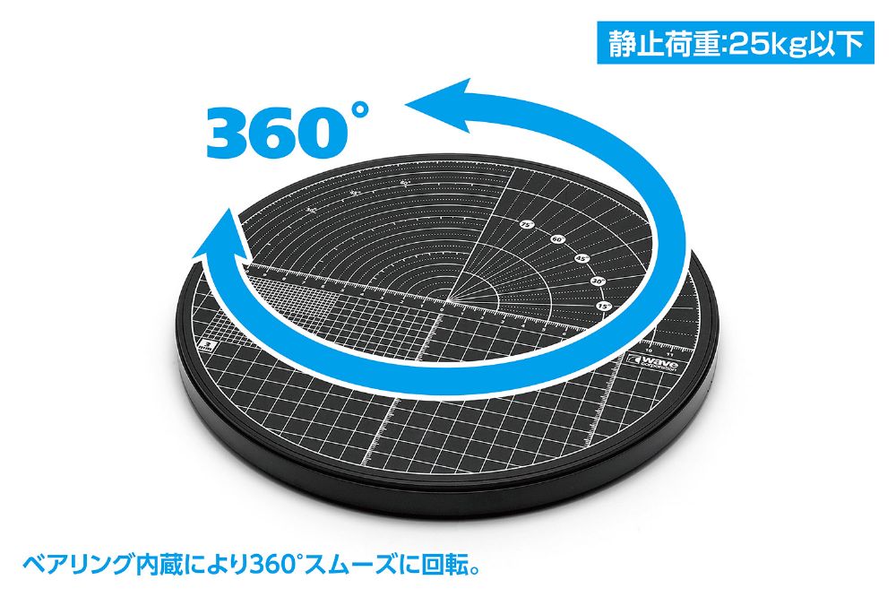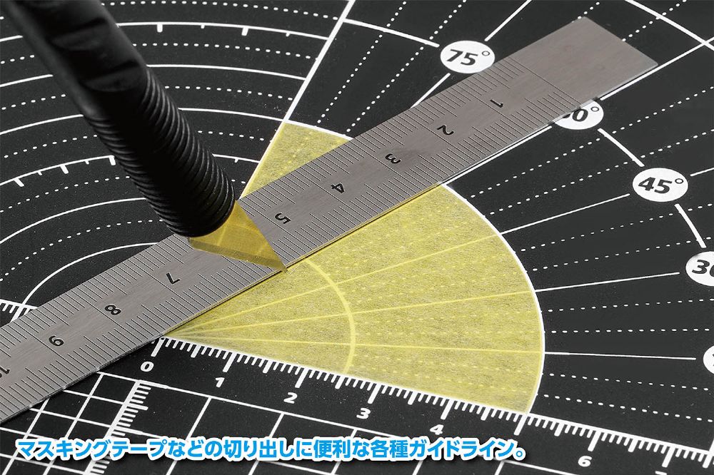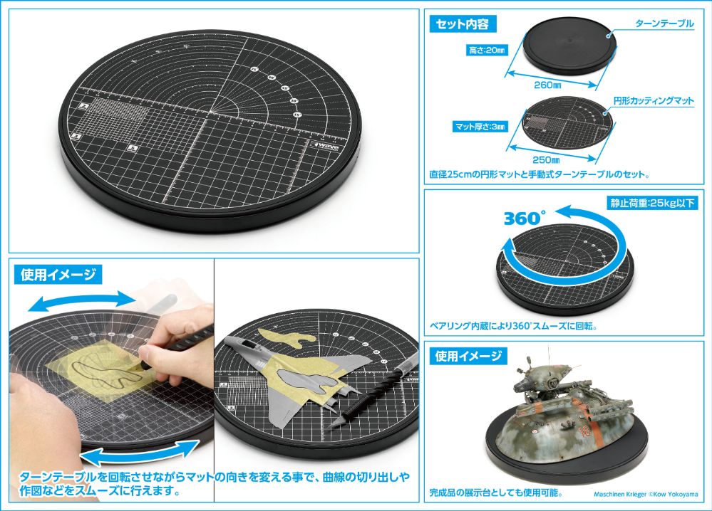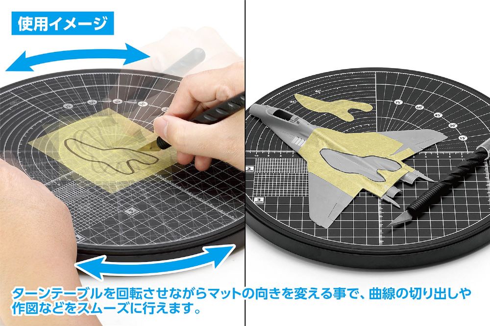 直径25cmの円形マットと手動式ターンテーブルのセットです。ターンテーブルはベアリング内蔵によりなめらかに回転。回転させながらマットの向きを変える事で、曲線の切り出しや作図などをスムーズに行えます。360度フリー回転できるので、塗装時の回転ベースや完成品の展示台としてもお使いいただけます。カッティングマットは落ち着いた雰囲気のブラックで、片面にマスキングテープなどの切り出しに役立つ各種ガイドラインを印刷しております(裏面も無地のカッティングマットとしてお使い頂けます)。マット面への刃当たりがやさしく、刃物の切れ味が長もちします。