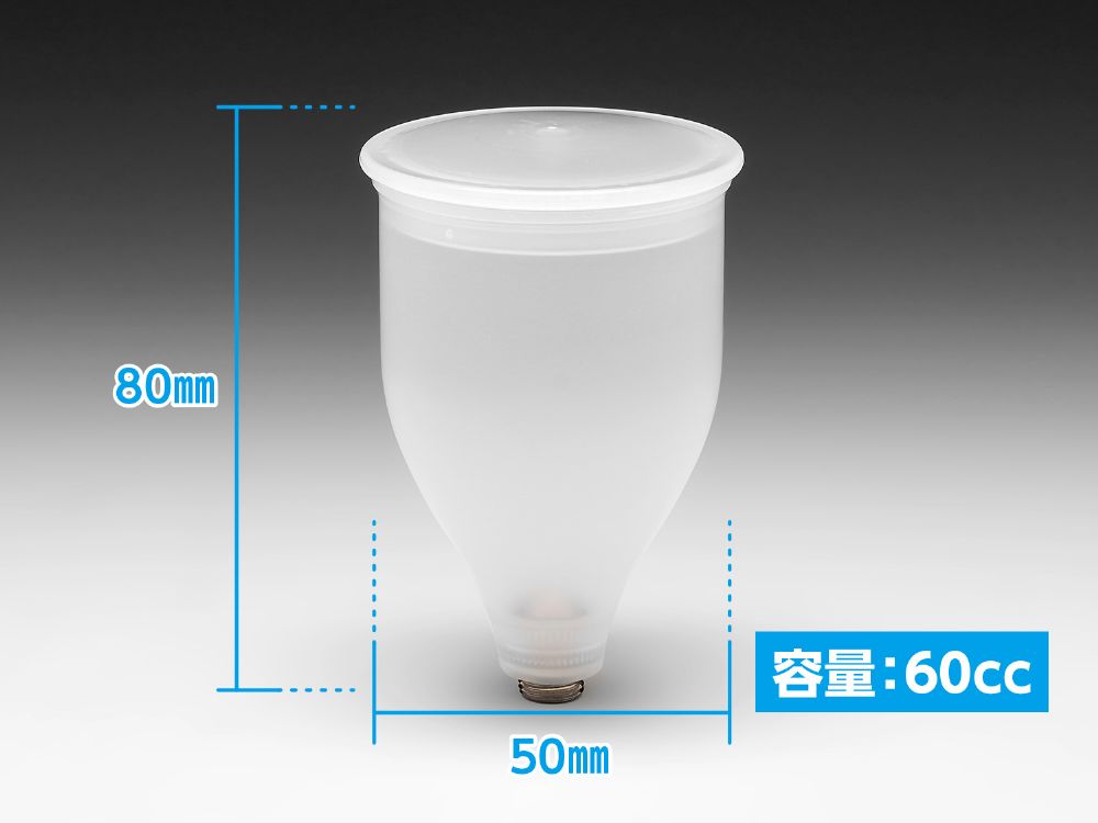 軽量で取り回しやすいエアブラシ用の塗料カップです。60ccタイプは本体重量約20gの軽量ボディ。大容量ですのでサーフェイサーやベースカラーの塗装時もつぎ足す回数が減り便利です。15ccタイプは本体重量約12g。同サイズの金属製カップの約1/3の重さで、エアブラシ作業時の負担を軽減します。どちらも耐溶剤性に優れ、中身の残量も分かりやすい半透明のPP(ポリプロピレン)材を採用。エアブラシとの接続部分にはテフロンOリングが装着済みで、ラッカー系溶剤への耐久性も万全としました。※対応機種(当社製品):HT-583 / HT-585 / HT-586 /HT-587 ※その他の製品には対応しておりません。