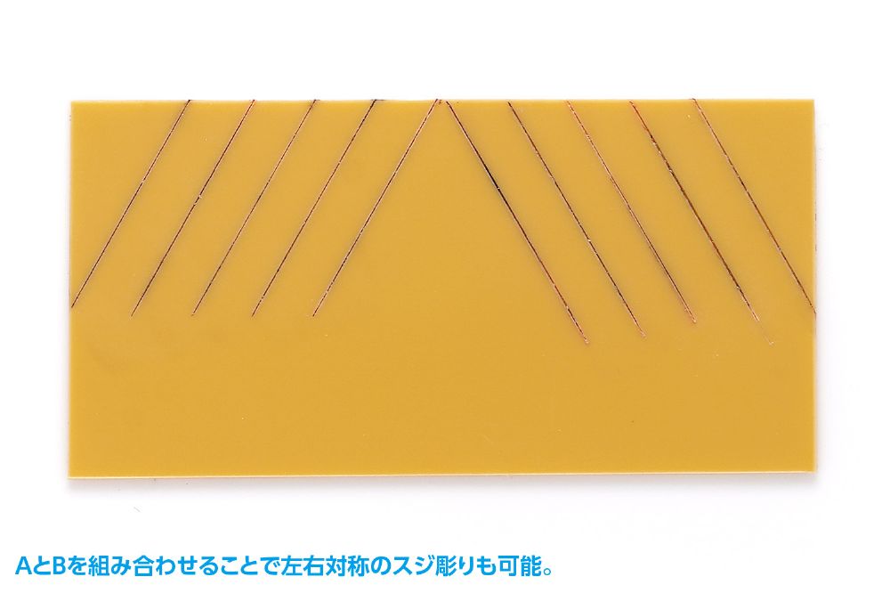 プラスチック板の切り出しの補助や、オリジナルパーツ製作時の計測作業などに便利なT定規です。作業にあわせて使い分けが出来るように、2種類の定規(A/B)をセッにしましたト。短く取り回しがしやすいため、パーツのフチにあてながら一定の角度でスジ彫りが行えるガイドとしても便利です。切断作業の際、ナイフやニードルの先端が定規に当たらないよう、交差部分に「逃げ穴」を加工。目盛は0.5mm刻みとしました。