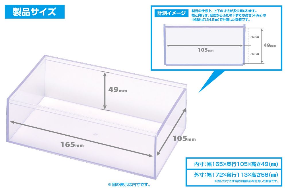 - ●内寸:165×105×49mm●製品サイズ:172×113×58mm(外寸)
