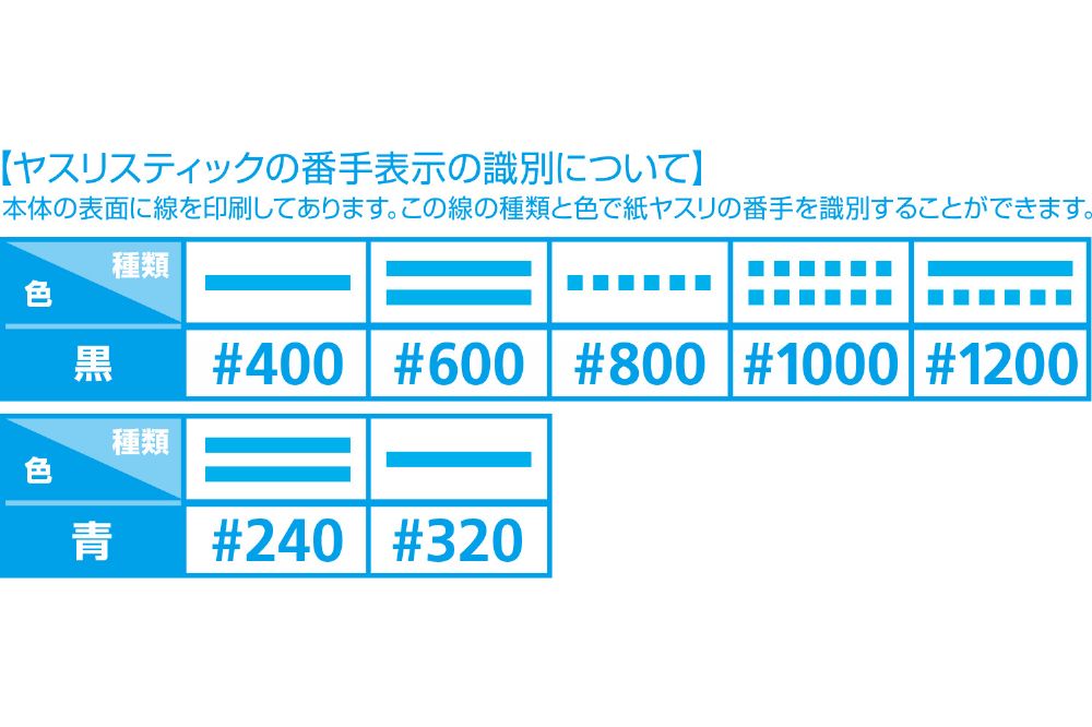従来のヤスリスティックよりも粗目な#240、#320がラインナップに加わります。原型製作やフルスクラッチの際の形状出しなど、切削力が必要な作業にお使いいただくことが可能です。従来品と同様にSOFT2には、芯になる中央部に硬質ベースを、その上下を軟質ベースではさんだ3層構造とし、両面に紙やすりをセットしました。HARD2は硬質ベースの本体の両面に紙やすりをセットしました。