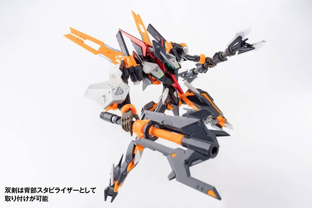 メイン武装は特徴的なシルエットの長槍で、いくつかのパーツに分解することが可能。これにより複数の武器状態に変化させることができます。サブ武器の片手持ち双剣は武器状態以外に、刃身パーツを背部にとりつけてスタビライザーにすることも可能。これによりロボット本体のフォルムにシャープさを追加することができます。さらに右肩・右腕には小型シールドがセットされ、全体のシルエットに適度なアクセントを持たせました。