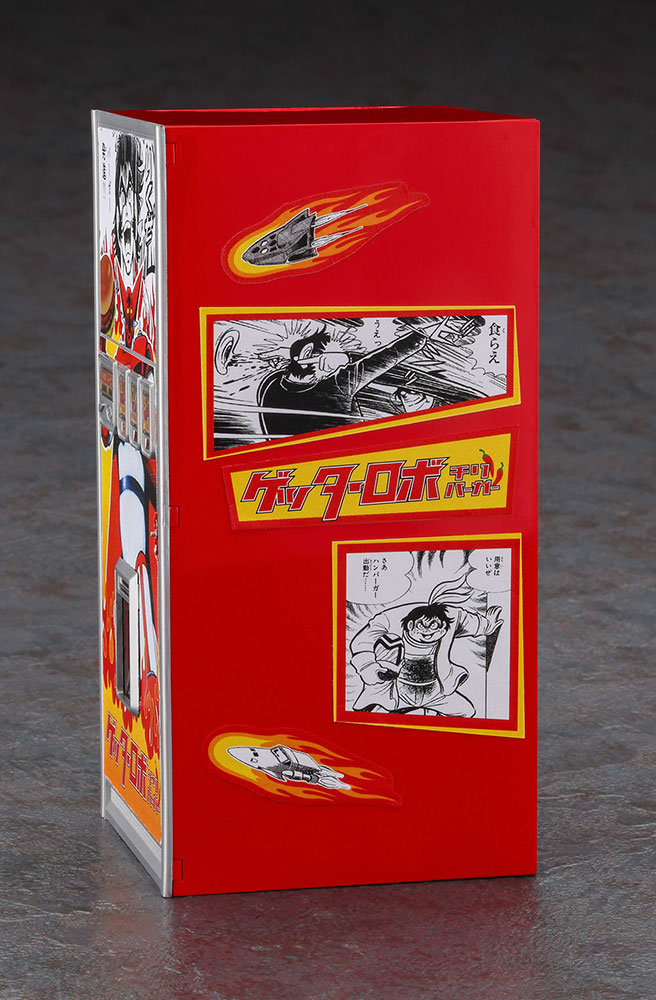 「ゲッターロボ」のイラストやロゴマークを配したオリジナルデザインの「ハンバーガー」自動販売機をキット化。