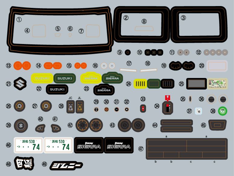 ・シールにはメーターパネルやロゴ、車両ナンバーなどを収録。