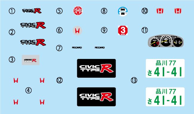 デカールには各種ロゴ、ナンバープレート、メーターパネル類を収録。