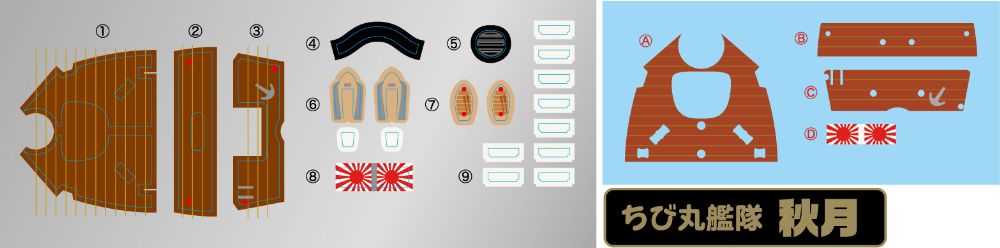 □シールにはリノリウム貼りの甲板、ファンネルキャップ、艦橋窓などを収録。