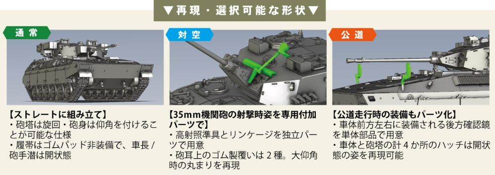 ・操縦手ハッチ、分隊長席ハッチは別パーツ化、「開/閉」どちらかの状態を選択可能