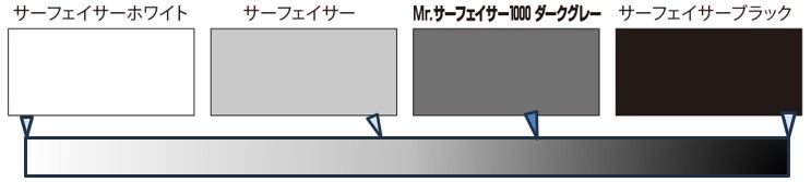 溶剤系のMr.サーフェイサーに、メカ部分などにそのまま使用できるなど、汎用性の高いダークグレータイプが登場です。発売中のホワイト、グレー、ブラックのサーフェイサーと併せてトーンを調節しやすくなります。