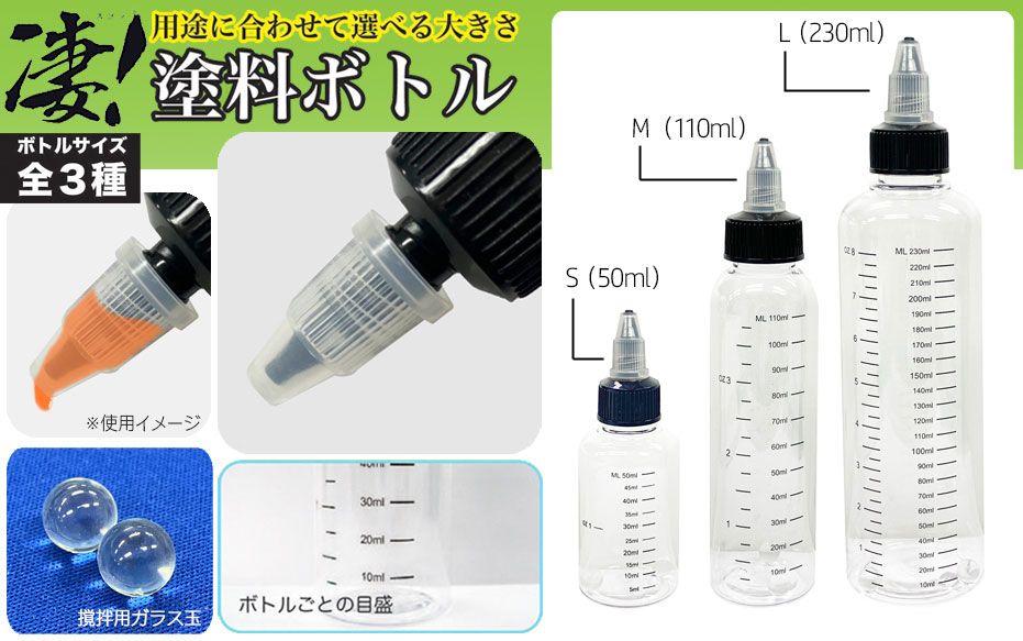 用途に合わせて選べる大きさ!「凄!ホビー用 塗料ボトル」が新登場します!ボトルサイズは50ml/110ml/230mlの全3種。撹拌に便利なガラス玉入りです。それぞれのボトルごとに目盛が付いており、計量の目安にお使いいただけます。片手で簡単、キャップ先端を回すだけで開閉可能!さらに、液量を調整しやすいツイストキャップに加え、ラッパ口のノズルでこぼれにくい!