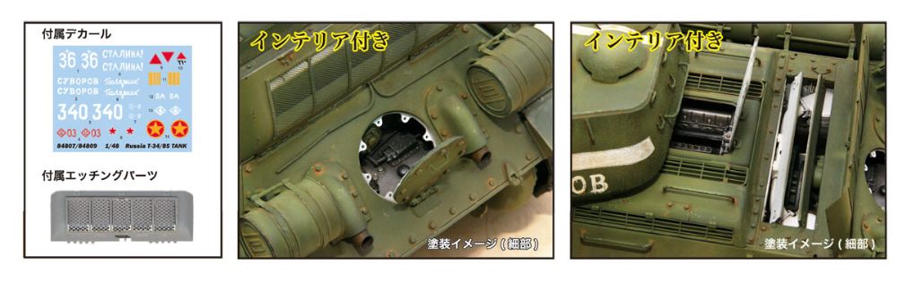 1/48スケールにロシアの名戦車が2種類登場します。「T-34/76(1942年型)」は車体全体に傾斜装甲を取り入れた優れたスタイルと、76mm砲の組み合わせで知られております!さらに「T-34/85(1944年型)」はT-34/76の発展型で、より強力な85mm砲を搭載!戦後も長期間使用された戦車です。どちらもリアルな彫刻とエッチングパーツを含む豊富なパーツに加え、インテリア付きで作り甲斐あり!