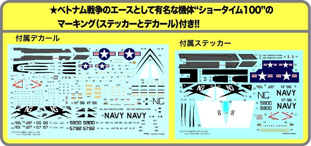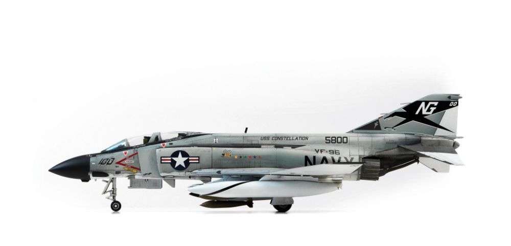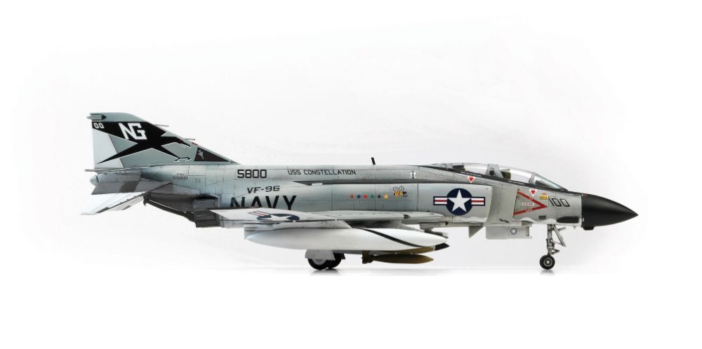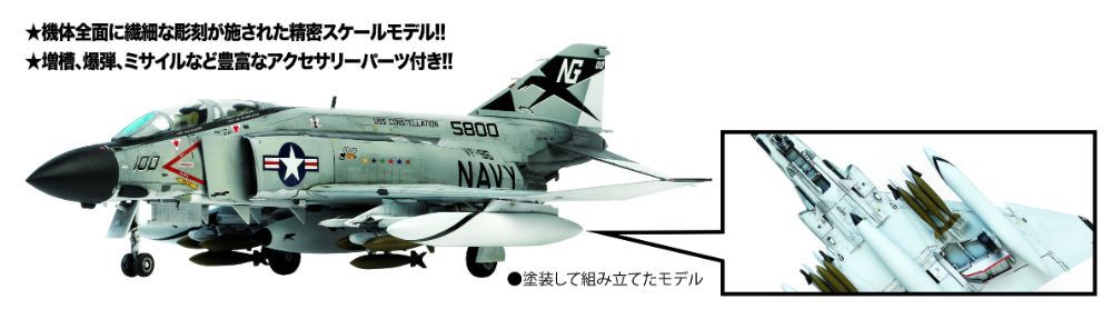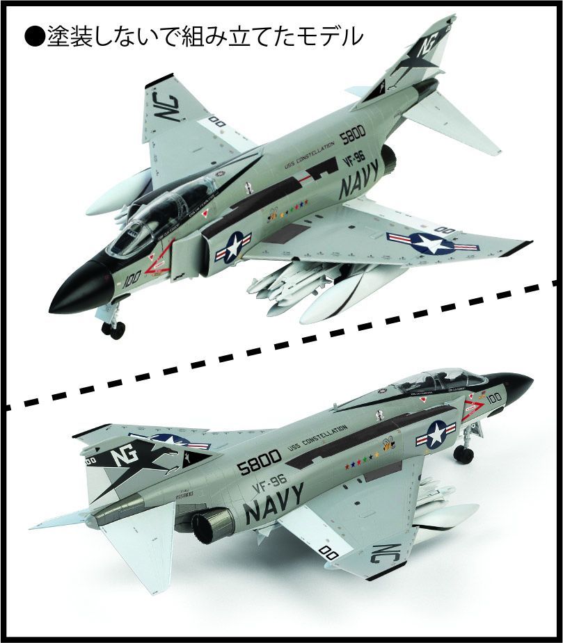 まさに“凄い” と呼べるプラモデルが再登場!その特徴は精密スケールモデルでありながら接着剤を使わずに組み立てられるスナップキットです。また実機に近いカラーで成形されており、塗装しないで組み立ててステッカーを貼るだけでリアルなモデルが作れます。もちろん詳細なデカールもついており、本格派モデラーの方々にも十分満足していただけます。機種は、アメリカ海軍のF-4JファントムⅡで、ベトナム戦争で活躍した第96戦闘飛行隊所属機 “ショータイム100” のマーキングとなっています。是非一作をお勧めいたします。 - サイズ