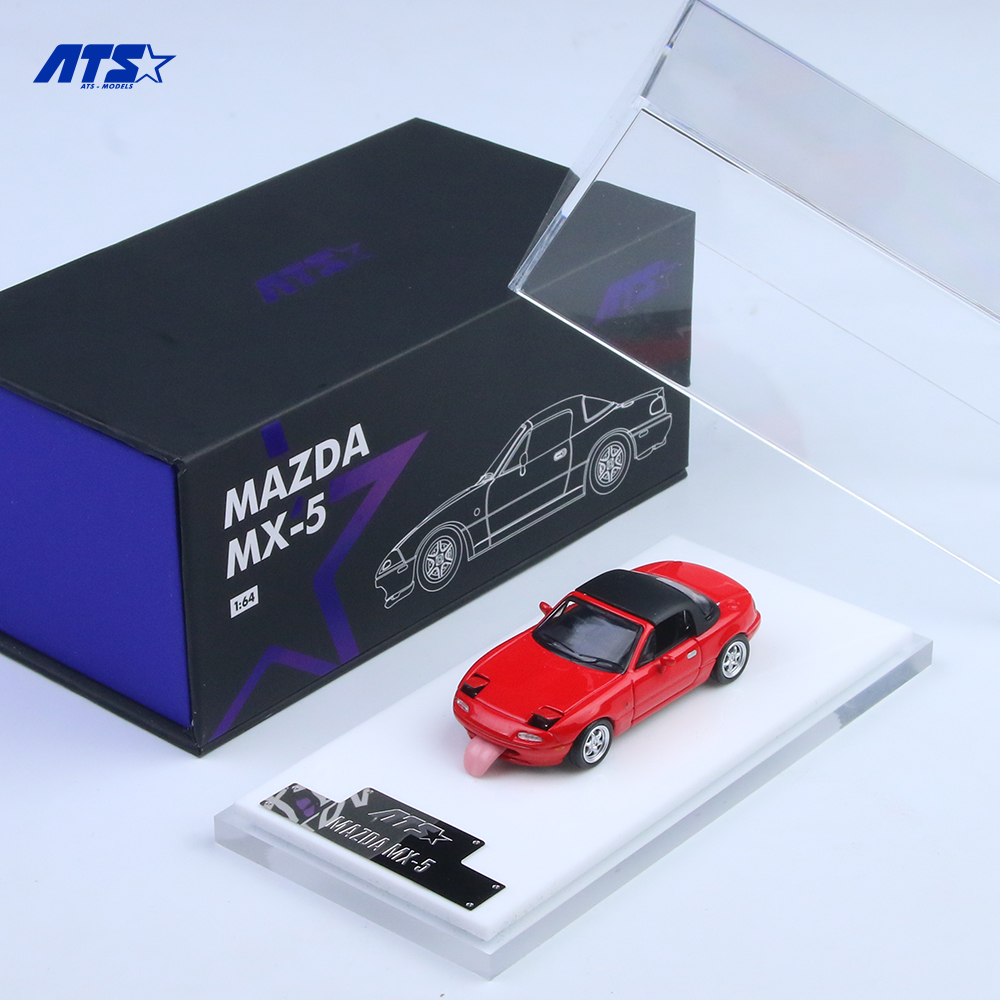 世界中で愛される初代MX-5(ロードスター)が、ATS MODELSより精密な1/64スケールで登場。最大の特徴は、付属の専用パーツで「舌出し(あかんべえ)」の愛くるしい表情を再現できるユニークなギミックです。手のひらサイズながら、実車の美しいラインと質感をダイキャスト合金で再現。刻印入りの専用台座とアクリルケースが付属し、コレクションとして、また車好きな方へのギフトとしても最適な、遊び心あふれる特別な一台です。