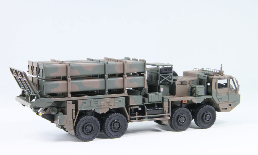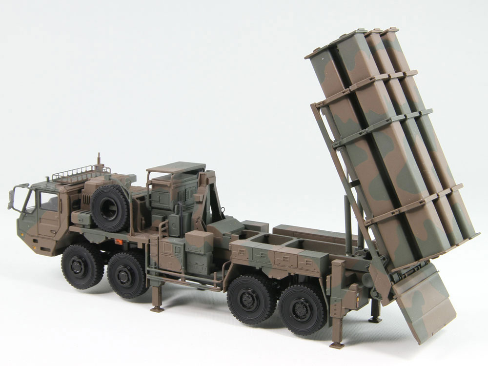 システム全体の構成は88式と同じですが、搭載車両とキャニスター(ミサイル収納容器)は大きく変更しています。車両は重装輪回収車と共通の車体に、88式の丸型から角型に変更された新型キャニスターを搭載し、その容姿は近代的なものへと一変しました。外観だけでなく、性能も格段の進歩を遂げ、目標情報更新能力、同時着弾機能、地形追随機能、指揮統制機能などが大幅に高精度化しました。
