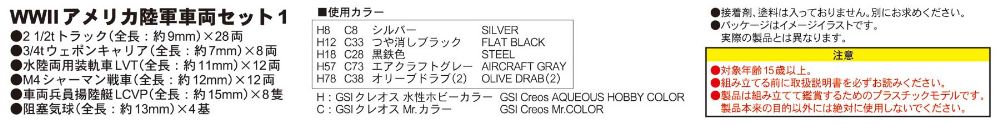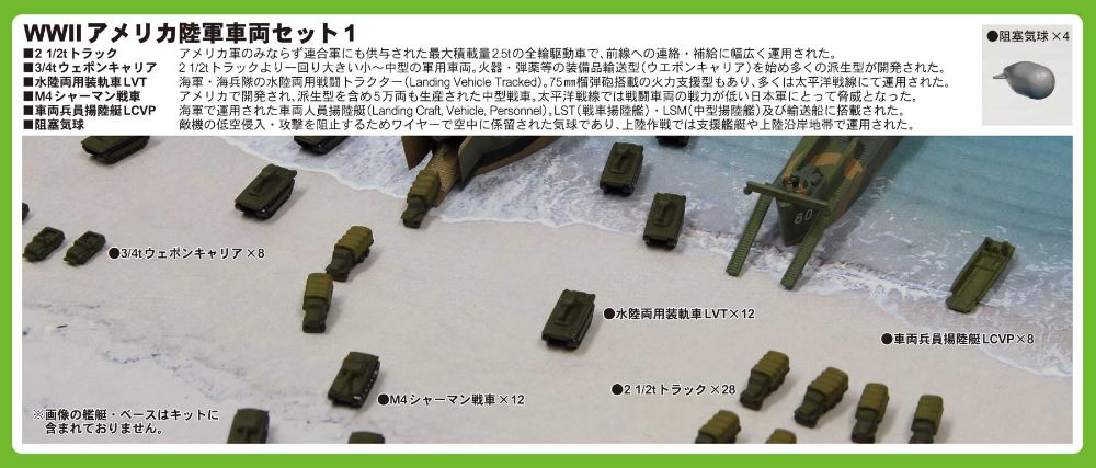 大戦中のアメリカ陸軍にて使用された車両の他、水陸両用装軌車やM4戦車、揚陸艇、阻塞気球のセットです。