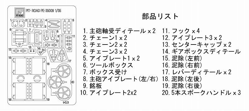 ・主砲軸受ディテール、チェーン(3種)、アイプレート(3種)、左右泥除(前部/後部)、ギアボックスディテール、5本スポークハンドル、左右主砲アイプレート、レバーディテールなどが含まれています。
