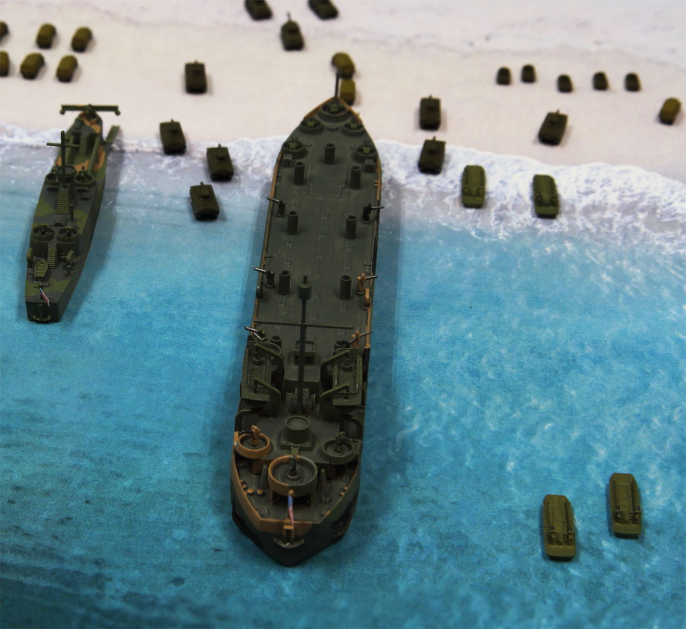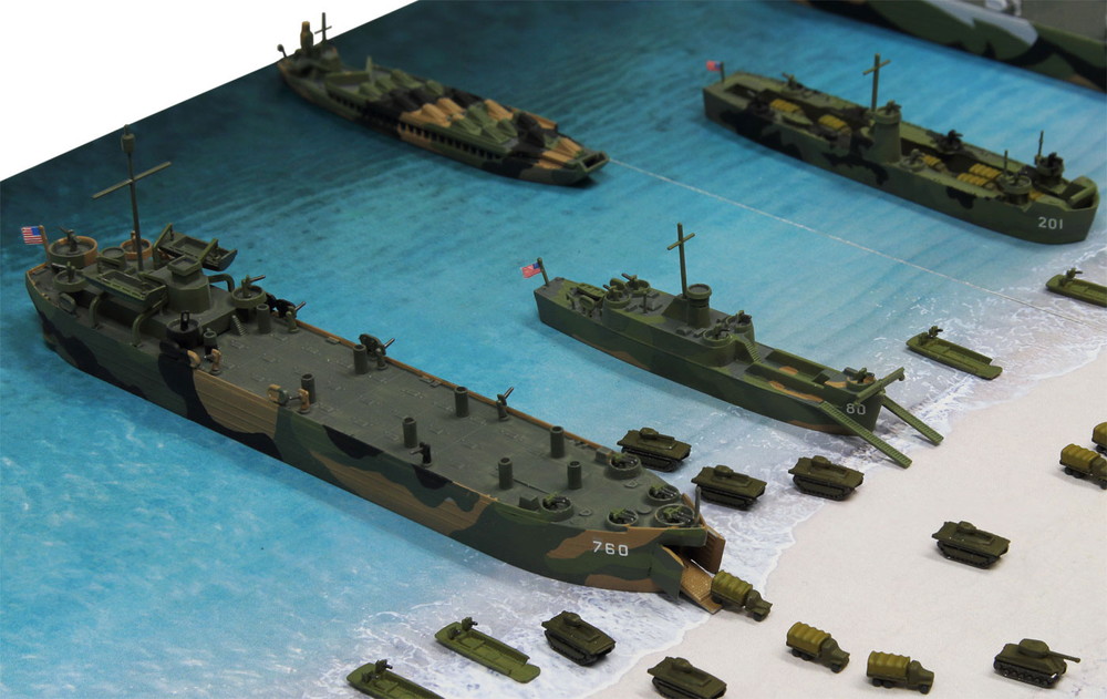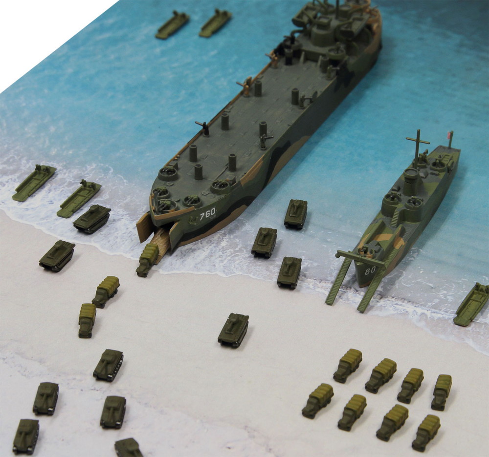 1945年2月19日に開始された、アメリカ軍によるイオージマ上陸作戦における、LST、LSM等の揚陸艦などによるビーチングの情景を再現できるプラモデルとペーパーベースのセットです