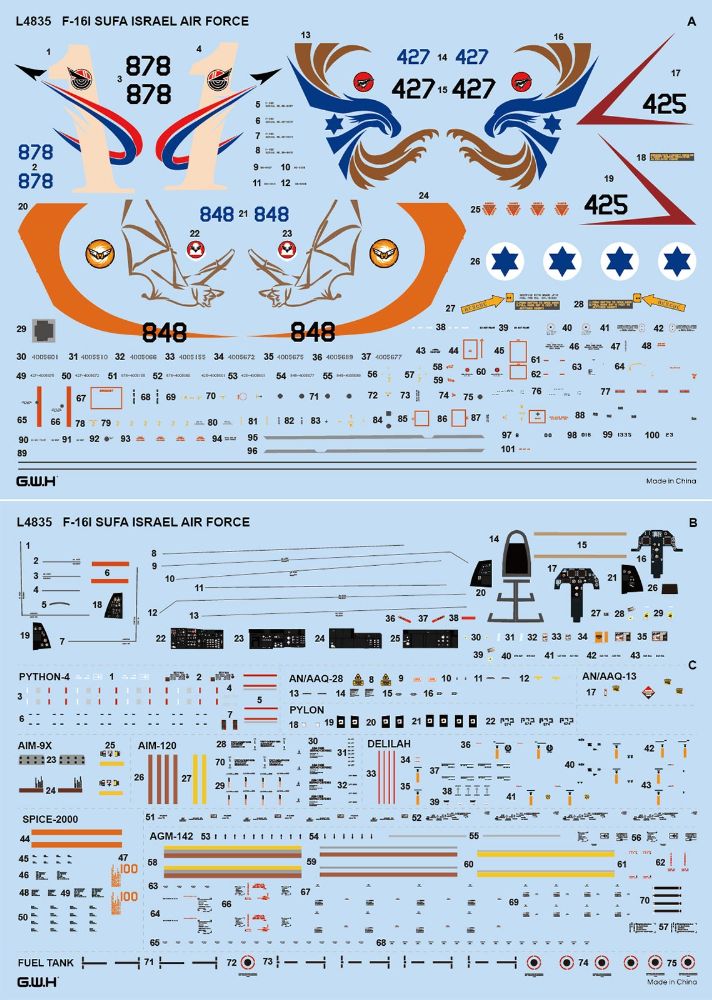 AIM-120、AIM-9X、SPICE2000、PYTHON4、AGM-142、DELILAH巡航ミサイル、データリンクポッド、AN/AAQ-13航法ポッド、AN/AAQ-28照準ポッド、増槽