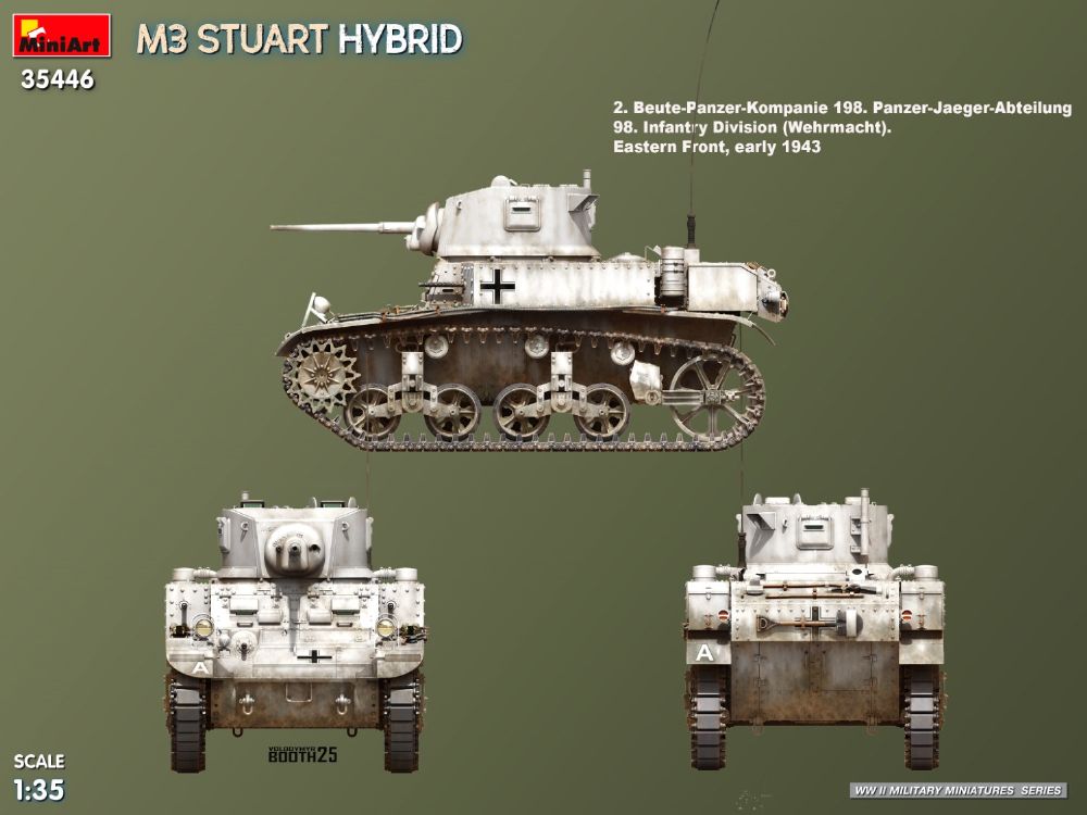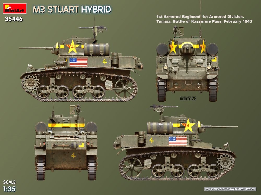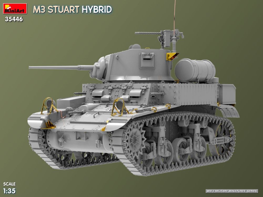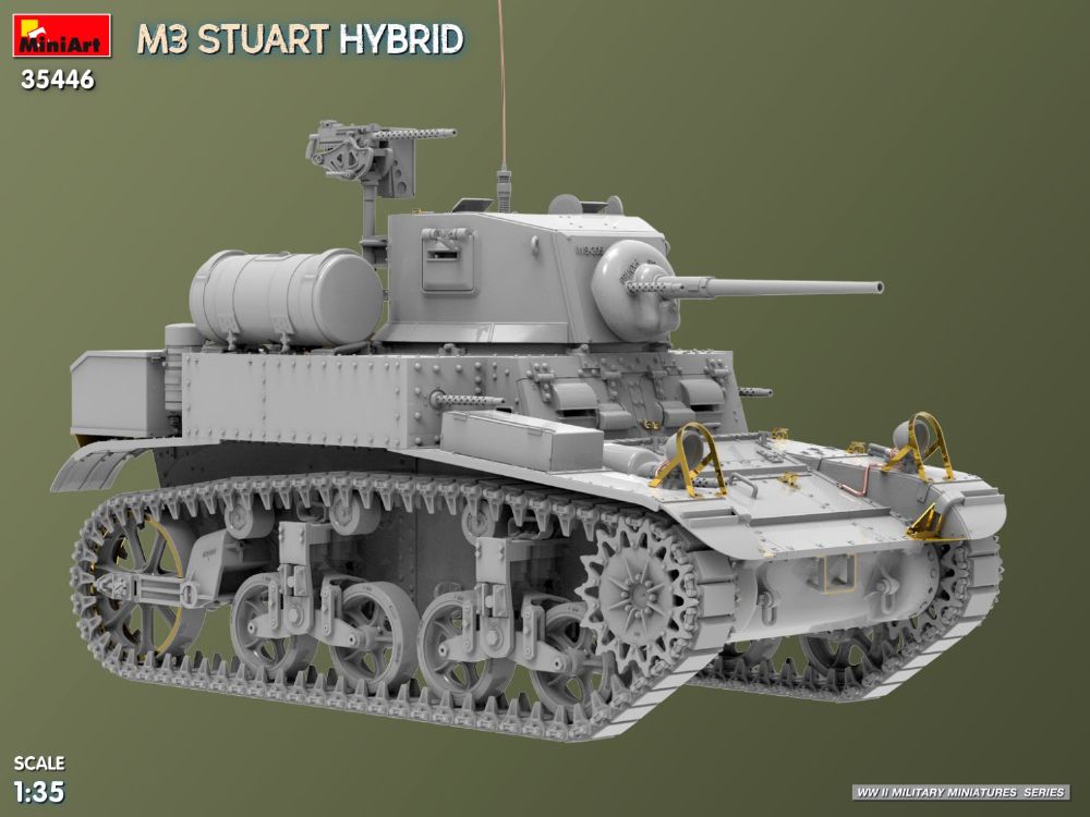 第二次世界大戦の複数の戦線で使用された、初期型と後期型の特徴を組み合わせた、M3 スチュアート ハイブリッド バージョンです。北アフリカやヨーロッパの戦場など、米国および連合国軍で使用された特徴的な車体と砲塔を正確に再現しています。