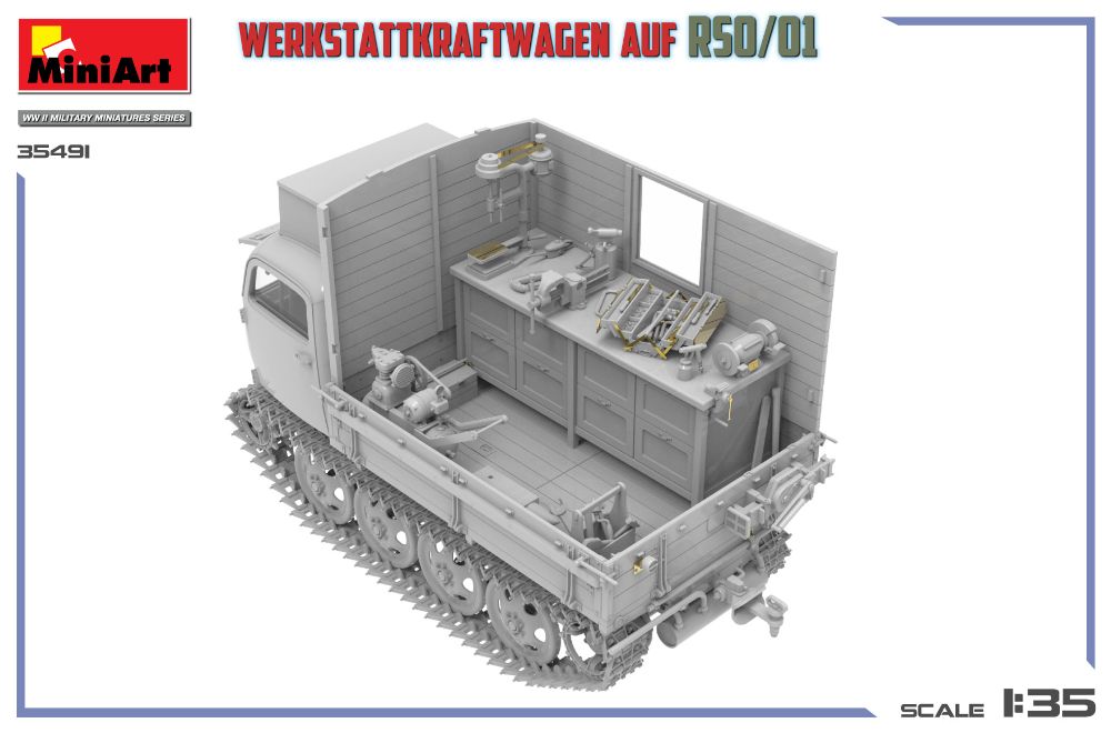この車両はRSO履帯式トラクターをベースに開発されたドイツ軍の移動式作業車であり、過酷な地形における戦場修理を支援するために設計されました。履帯式シャーシは全地形に対応し、密閉された作業室を搭載した車体は前線近くでの整備作業を可能にしました。