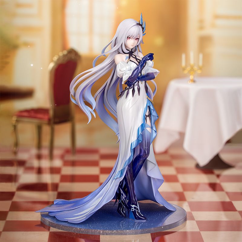深淵から来たスカークの姿を、ラメ入りクリアパーツで繊細に表現。グラデーションとクラック塗装が織りなす質感が、アビスならではの冷たい鋭さを際立たせます。髪を軽やかになびかせる彼女の衣装は、白のパール塗装を基調に上品に仕上げました。裾にあしらわれた紫と青のラメが、揺らめく星空のような華やかな輝きを演出します。輝く夜空のような台座が、喧騒から離れた彼女の凛とした佇まいをより一層引き立ててくれるでしょう。