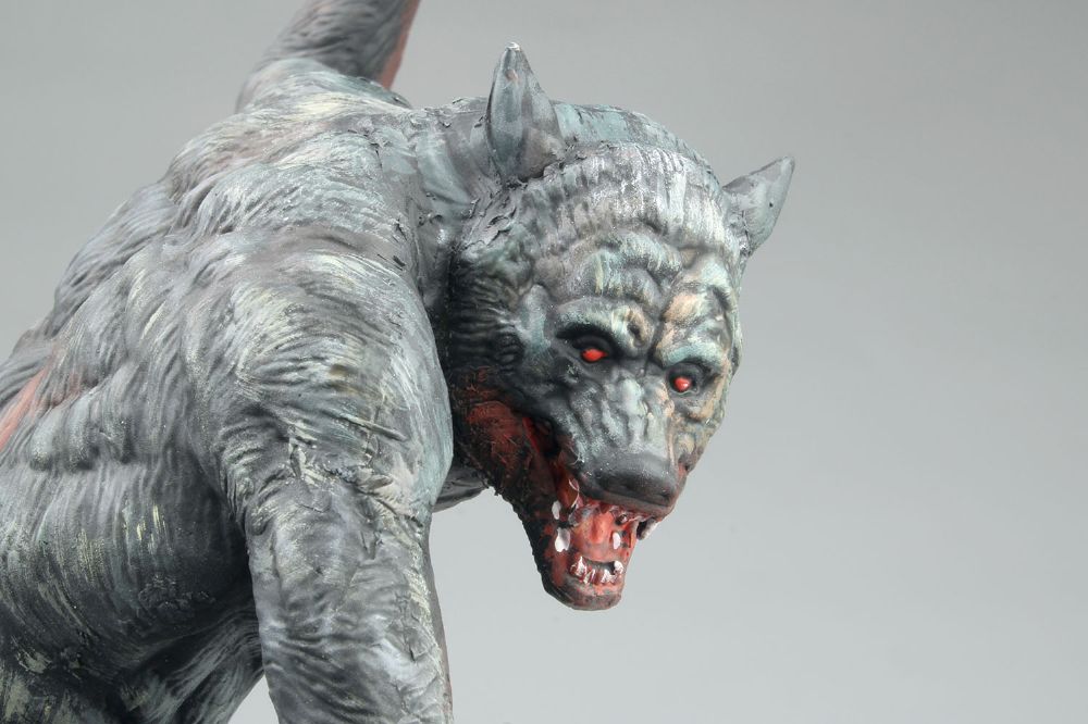 モデルはアメリカのホラーコミック誌、クリーピー(Creepy)の1966年2月号、クリーピー(Creepy)#7の表紙を飾ったフランク・フラゼッタのイラストをベースに立体のフィギュアとしたプラスチックモデル組み立てキットです。スケールは1/8、パーツ点数は47点。さまざまな小説や映画でおなじみの狼男とドラキュアの対決シーンを描いたイラストをモデル化しています。狼男の顔はもちろんドラキュラに襲いかかるポージングや体の各部の筋肉の表現など、迫力あふれる造形。そして、ドラキュラは首を掴む狼男を睨みつける鬼気迫る形相が見逃せません。2体のモンスターが組み合う舞台となる台座も岩の雰囲気もリアルに再現。パッケージに掲載されたフラゼッタのイラストを参考に塗装表現に腕をふるってみるのが楽しみです。