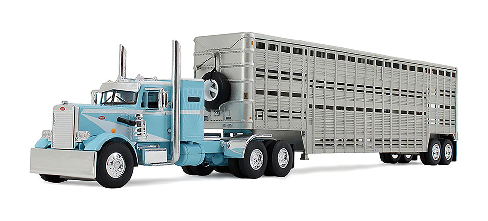 組み合わされるトレーラーは独特なデザインとスタイルが特徴の家畜運搬用タイプです。形状のみならず多くの穴が開けられたボディのディテールも詳細に再現。また、下面のフレームやサスペンションなど、詳細に再現されたメカニズムも見逃せません。このモデルではピータービルト351が青とホワイトの2トーンに塗装されています。
